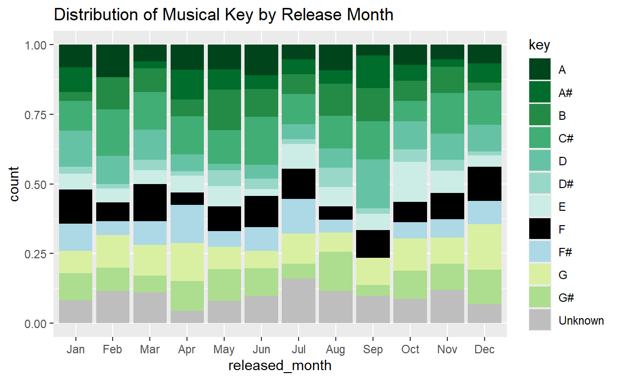 When looking at this stacked mosaic bar charts there are a few things to note on how a songs key relates to the month. Firstly, the key popularity is mostly consistent across months.There is a consistent green section (representing keys like A, A#, B, C#, etc.) dominating the chart in every month. These keys are more frequently released compared to others. Keys A, A#, B, C# are consistently high across months indicating that they are either more commercially successful or more genre-flexible. There are also slight monthly variations in the distribution like July and September show a larger share for F. April or August being more balanced across more keys.