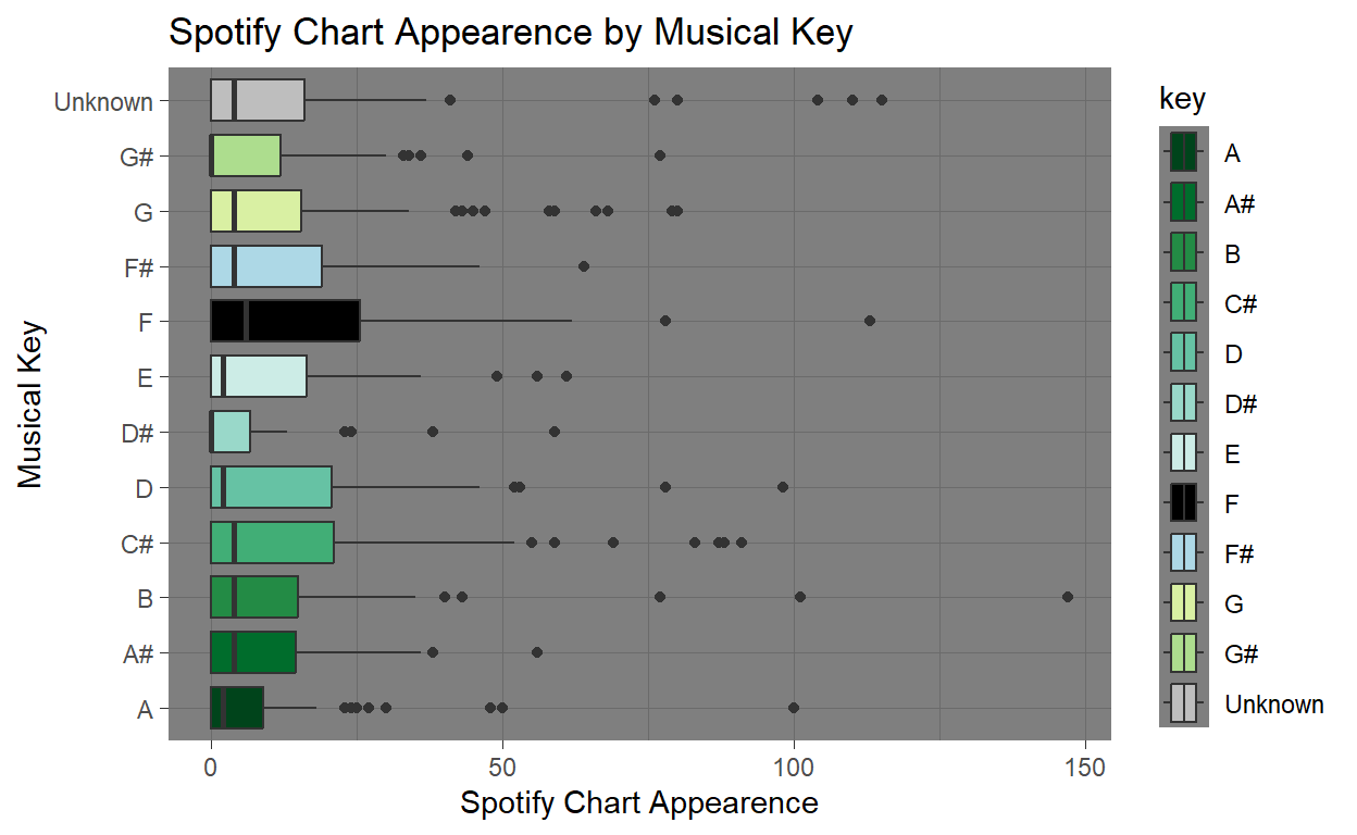 All keys display a generally right-skewed distribution, with many songs clustered at lower chart apparence.Most musical keys have chart appearances heavily concentrated near lower values. The median for almost all keys is low, suggesting that most songs in each key don’t appear frequently in the charts. Nearly every key has outliers, shown as dots to the right of the boxes. These indicate tracks in that key that charted significantly worse than the others. Keys like D, C#, and G have more significant chart representation, indicated by more frequent outliers while Some keys (A#, B, D#) show more clustered points, implying their songs tend to have more predictable performance in the charts.From this we can infer that key choice matters where certain keys appear to have a higher likelihood of charting multiple times (G, F, C#), while others are more stable but less frequently chart-topping (D#, A#).