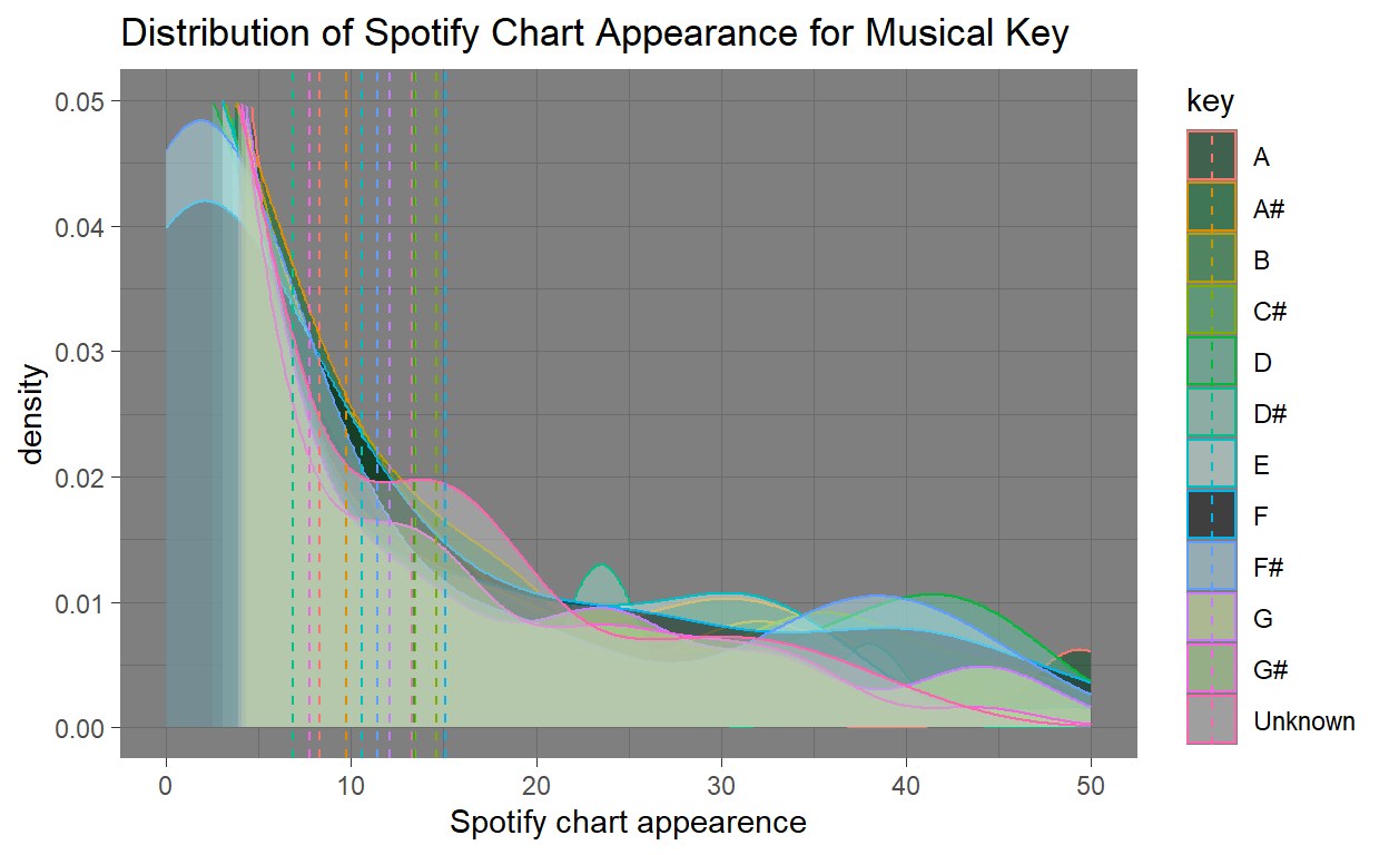 When looking at the density plot for Spotify chart appearance,The distribution is heavily right-skewed since most of the density is near 0 indicating that the majority of songs do not get substantial chart play, regardless of their key. Additionally all keys have similar mean values suggesting that chart performance is not significantly influenced by musical key alone. No single key appears to dominate in terms of higher mean appearances. With this we can infer that there is no musical key that significantly stands out in terms of average Spotify chart appearances.