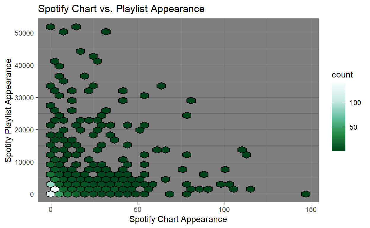 This plot shows a hexbin plot, which visualizes the density of data points in two dimensions. The x-axis represents a tracks appearance in Spotify charts while the y-axis shows how many times a track is included in Spottily playlists. The color intensity represents the count of points in each hexagon, with darker colors indicating higher density. With this in mind we can see the most data points are clustered around the high ranking tracks for Spotify charts and playlists. This suggests many tracks appear in a few charts and are included in only a few playlists.